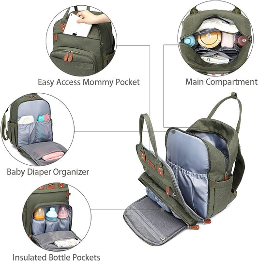 Diaper Bag Backpack, Green, with Changing Pad, 16.5X8X12 Inches, Large Capacity, 18 Pockets, Waterproof, for Baby Girl Boy
