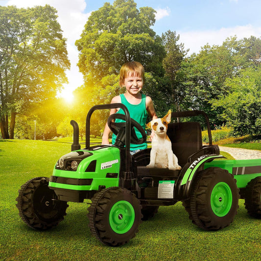 Electric Ride on Tractor with Trailer, Battery Powered Tractor Motorized Vehicles for Kids W/Remote Control, Music, Horn, Spring Suspension,Green
